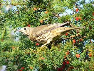 For some reason I have never seen a Mistle Thrush in this tree, although these birds eat other kinds of berries, especially rowan. But I suppose that all species have their preferences. The taxonomic name of the Mistle Thrush is Turdus viscivorus, the mistletoe-eating thrush, but mistletoe is a rare plant in Britain now and I have never seen this and a thrush at the same time.