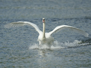 A Mute Swan was descending on to the Serpentine, water-skiing with its big feet to reduce the impact.