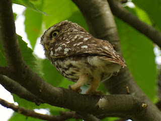 First, the Little Owls in the chestnut tree definitely have two owlets. Paul Turner saw both of them looking out of the nest hole, bobbing their heads from side to side to get a view of the outside world. But when I came past they had gone in and didn't reappear. So here is the male owl preening elsewhere in the tree.