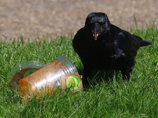 Near the Rose Garden, a Carrion Crow was enjoying the remains of a pot of pasta with cheese and tomato sauce. It was one of a number of things it had hauled out of a rubbish bin.