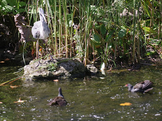 The Moorhens in the Dell have four chicks. The other two could be seen indistinctly climbing around between the stems.