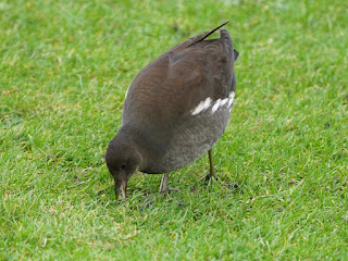 One of the young Moorhens from the Italian Garden was foraging along the grass at the edge. It's still showing no sign of coming out of its teenage brown into adult colours.