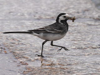 The female Pied Wagtail often seen by the Serpentine hunted insects on the boathouse roof, came down to check the kerb, and visited the electric boat charging platform.