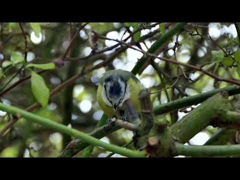 A Blue Tit eating a pine nut in the Rose Garden was knocked off its perch by a Great Tit.